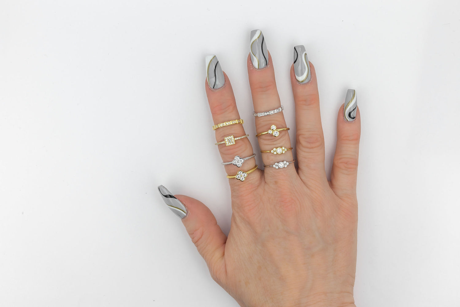 Sterling silver & 14k over sterling. The link goes around the entire ring and the stones are all cz. Works back to the Mariner drop or mariner chain.