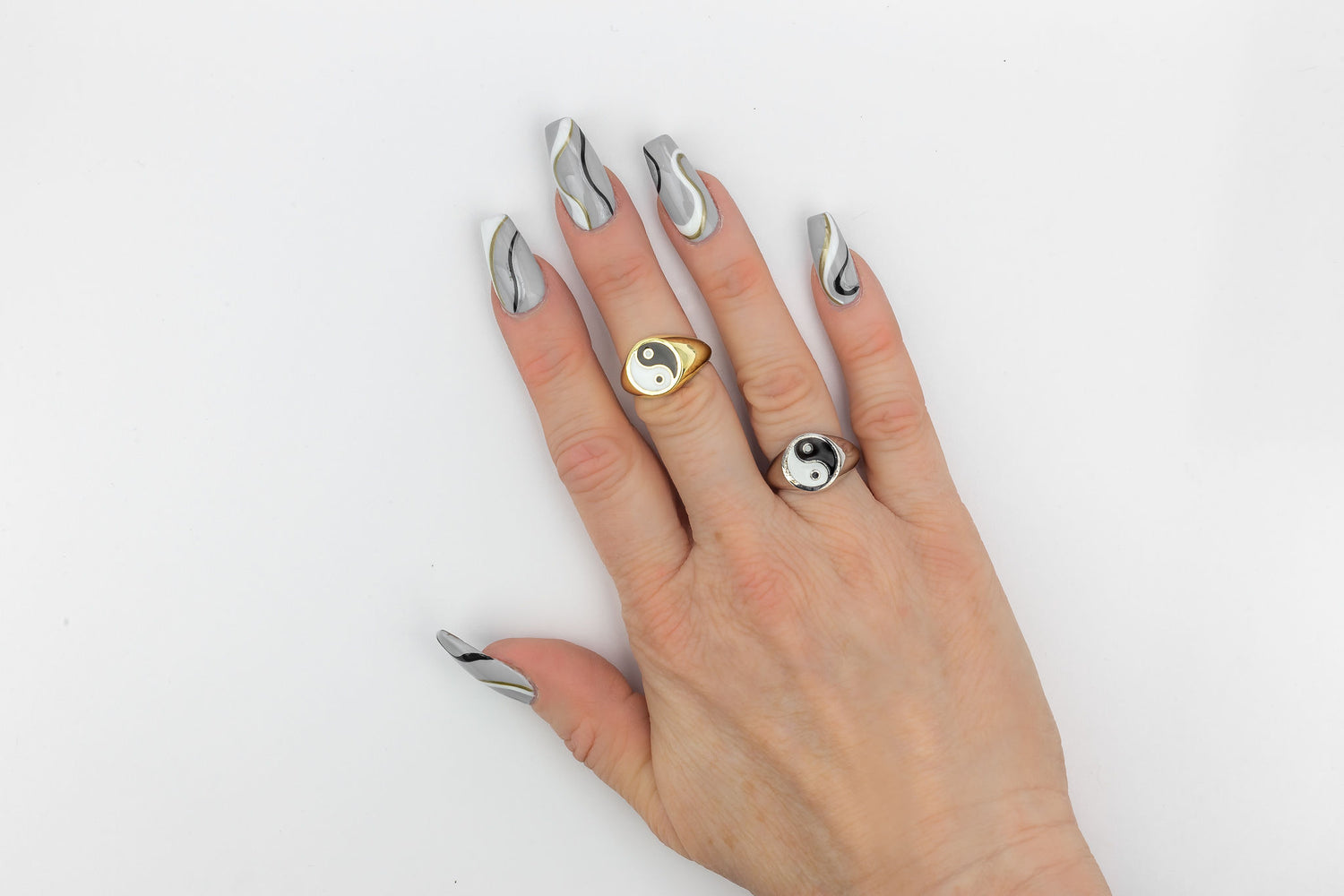 Sterling silver & 14k over sterling. Open adjustable back for perfect sizing. Comes in black/white.